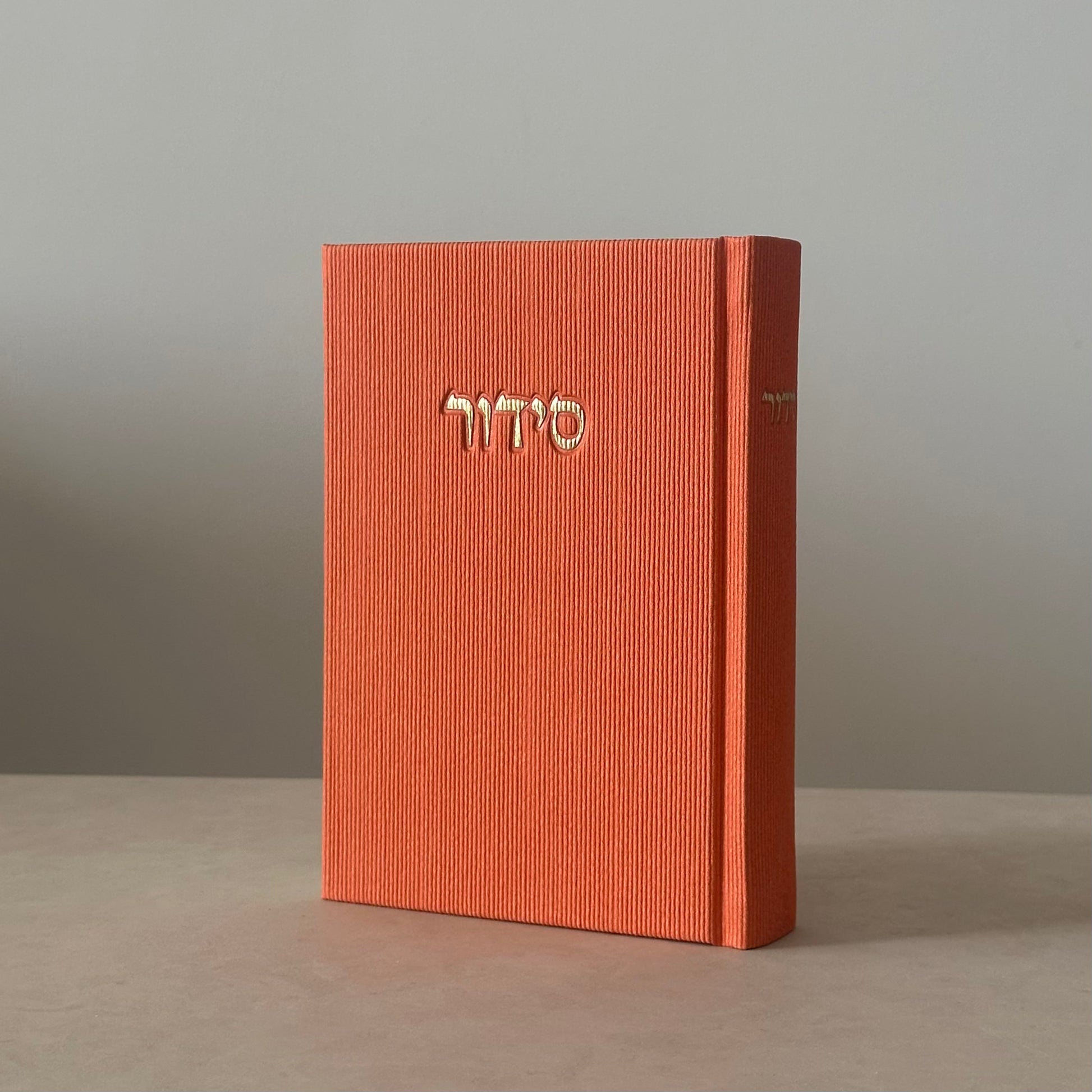 Wrapped in rich Solomon-orange corduroy, this siddur carries a luminous, uplifting presence - a warm glow that enriches every moment of prayer.